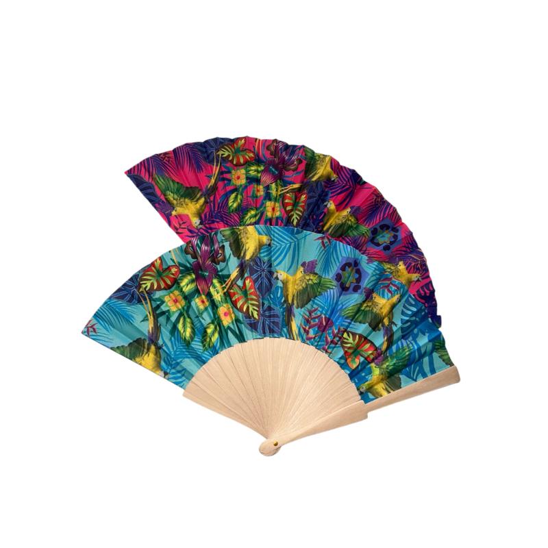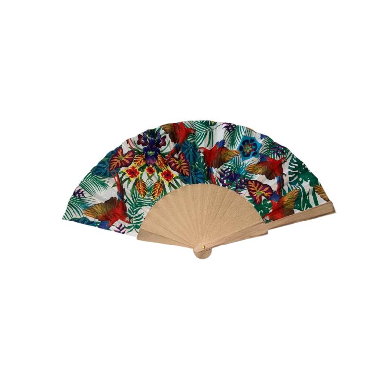 Γυναικεία Ισπανική ξύλινη βεντάλια με σχέδια από παπαγαλάκια , άνθη και φυτά και ξύλινη βάση σε φυσικό χρώμα, σε ποικιλία αποχρώσεων. Η συγκεκριμένη βεντάλια διαθέτει ξύλινη βάση, ενώ το τελείωμα της αποτελείται από ύφασμα. Μείνετε δροσεροί και κομψοί καθόλη τη διάρκεια του καλοκαιριού! Με υλικά υψηλής ποιότητας, αυτή η βεντάλια δεν είναι μόνο πρακτική αλλά και ένα εκπληκτικό αξεσουάρ για να ολοκληρώσει κάθε εμφάνιση. Το λείο και γυαλισμένο ξύλο παρέχει άνετο κράτημα και εξασφαλίζει την ανθεκτικότητα, ώστε να μπορείτε να την χρησιμοποιείτε και τα επόμενα χρόνια. Επιπλέον, ο διαχρονικός σχεδιασμός του σημαίνει ότι δεν θα φύγει ποτέ από τη μόδα.