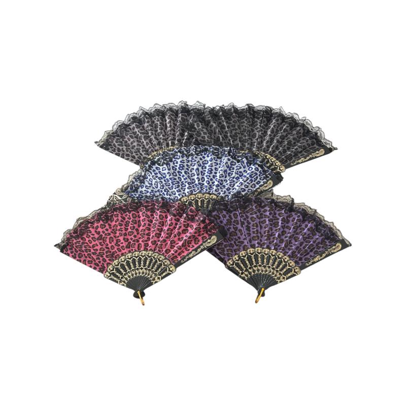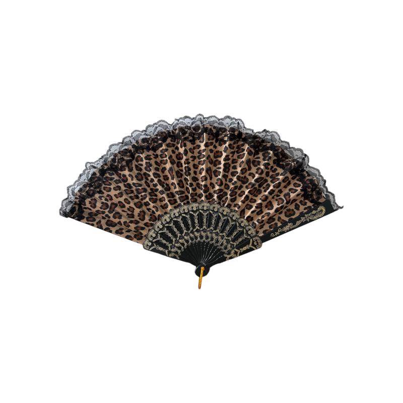 Γυναικεία πλαστική βεντάλια με λεοπάρ σχέδιο, μάυρη βάση και μαύρη δαντέλα στο τελείωμα της, 23cm. Η συγκεκριμένη βεντάλια διαθέτει πλαστική βάση με χρυσό κρίκο, ενώ το τελείωμα της αποτελείται από ύφασμα και δαντέλα. Με υλικά υψηλής ποιότητας, αυτή η βεντάλια δεν είναι μόνο πρακτική αλλά και ένα εκπληκτικό αξεσουάρ για να ολοκληρώσει κάθε εμφάνιση. Επιπλέον, ο διαχρονικός σχεδιασμός του σημαίνει ότι δεν θα φύγει ποτέ από τη μόδα. Κατάλληλη για τη ζέστη του καλοκαιριού.