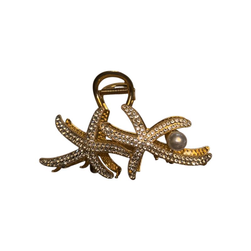Γυναικείο μεταλλικό κλάμερ μαλλιών χρυσό, με 2 αστερίες και μία πέρλα, 11εκ. Το συγκεκριμένο κλάμερ μαλλιών έχει επιλεχθεί με ιδιαίτερη προσοχή, ώστε να πιάνουν καλά τα μαλλιά σας, χωρίς να προκαλούν οποιαδήποτε ενόχληση και να τα τσακίζουν. Ιδανικό αξεσουάρ σε για κάθε έξοδο σας!