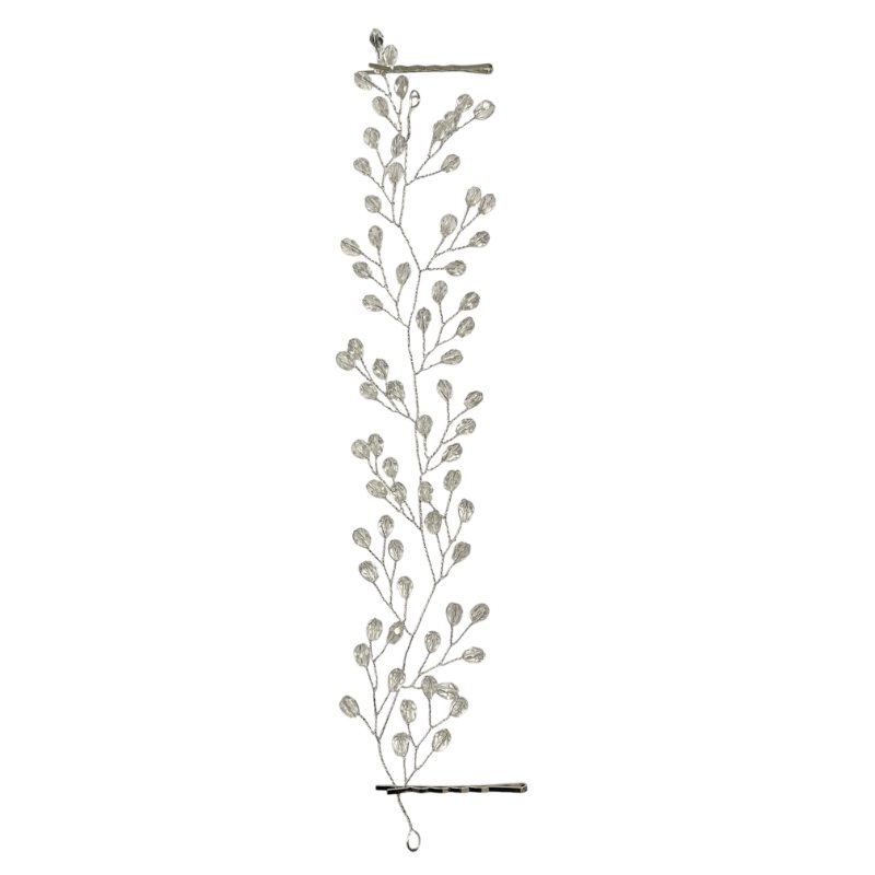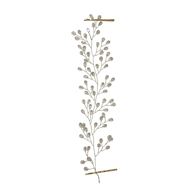 Νυφικό αξεσουάρ μαλλιών με μεταλλικό σύρμα ντυμένο με λαμπερά κρύσταλλα σε σχέδιο σαν φυλλαράκια. Διατίθεται σε χρυσό και ασημί χρώμα. Το συγκεκριμένο νυφικό αξεσουάρ διαθέτει τσιμπιδάκια στα πλαϊνά του για να το στολίσετε με ευκολία στα μαλλιά και το πέπλο σας. Ένα ιδιαίτερο αξεσουάρ μαλλιών, όπου τα διακριτικά του στρας θα αναδείξουν την κομψότητα του νυφικού σας και θα σας εγγυάται ένα Bridal look με λάμψη και στυλ. Ιδανικό και για επαγγελματίες.