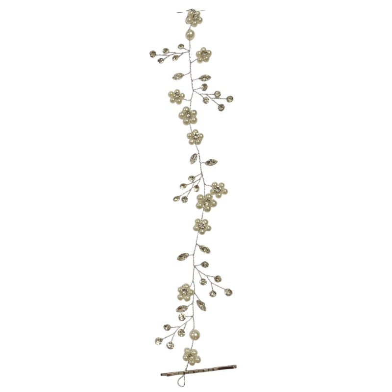 Νυφικό αξεσουάρ μαλλιών χρυσό με μεταλλικό σύρμα ντυμένο με λουλουδάκια από πέρλες, και φύλλα ντυμένα με λαμπερά μικρά στρας και κρύσταλλα. Το συγκεκριμένο νυφικό αξεσουάρ διαθέτει τσιμπιδάκια στα πλαϊνά του για να το στολίσετε με ευκολία στα μαλλιά και το πέπλο σας. Ένα ιδιαίτερο αξεσουάρ μαλλιών, όπου τα διακριτικά του στρας θα αναδείξουν την κομψότητα του νυφικού σας και θα σας εγγυάται ένα Bridal look με λάμψη και στυλ. Ιδανικό και για επαγγελματίες.