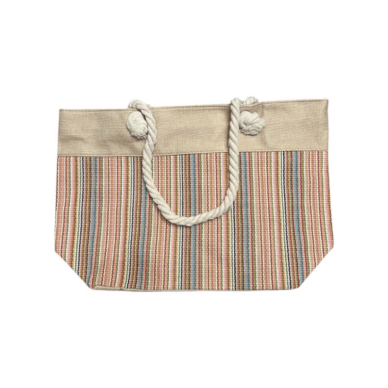 Τσάντα θαλάσσης με πολύχρωμες κάθετες ρίγες σε ροζ και μπλε αποχρώσεις και χοντρό σχοινί ως χερούλι, που κλείνει με φερμουάρ. Διαστάσεις: [55×37]
