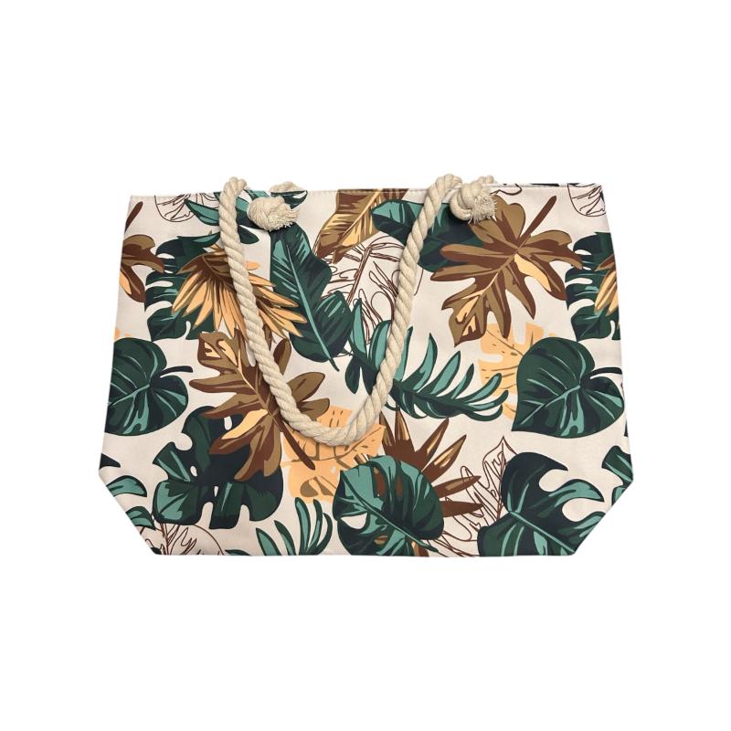 Τσάντα θαλάσσης με σχέδια φύλλων σε χρυσές και πράσινες αποχρώσεις, με χοντρό σχοινί ως χερούλι, που κλείνει με φερμουάρ, από χοντρό, ανθεκτικό ύφασμα. Διαστάσεις: [55×37]