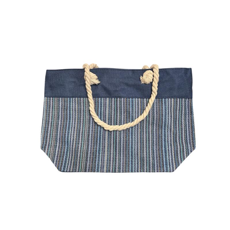 Τσάντα θαλάσσης μπλε σκούρι με κάθετες ρίγες και χοντρό σχοινί ως χερούλι, που κλείνει με φερμουάρ. Ανακαλύψτε την κομψότητα και την προστασία του καλοκαιριού με αυτή τη μοναδική τσάντα θαλάσσης! Κατασκευασμένη από ανθεκτικό ύφασμα και σε αποχρώσεις του μπλε είναι δανική για όσους αγαπούν το στυλ με ελληνικό χαρακτήρα. Το χοντρό ανθεκτικό σχοινί ως χερούλι και η ευρύχωρη χωρητικότητα, την καθιστά ιδανική για την παραλία, την πισίνα ή ακόμα και για τις βόλτες σας.