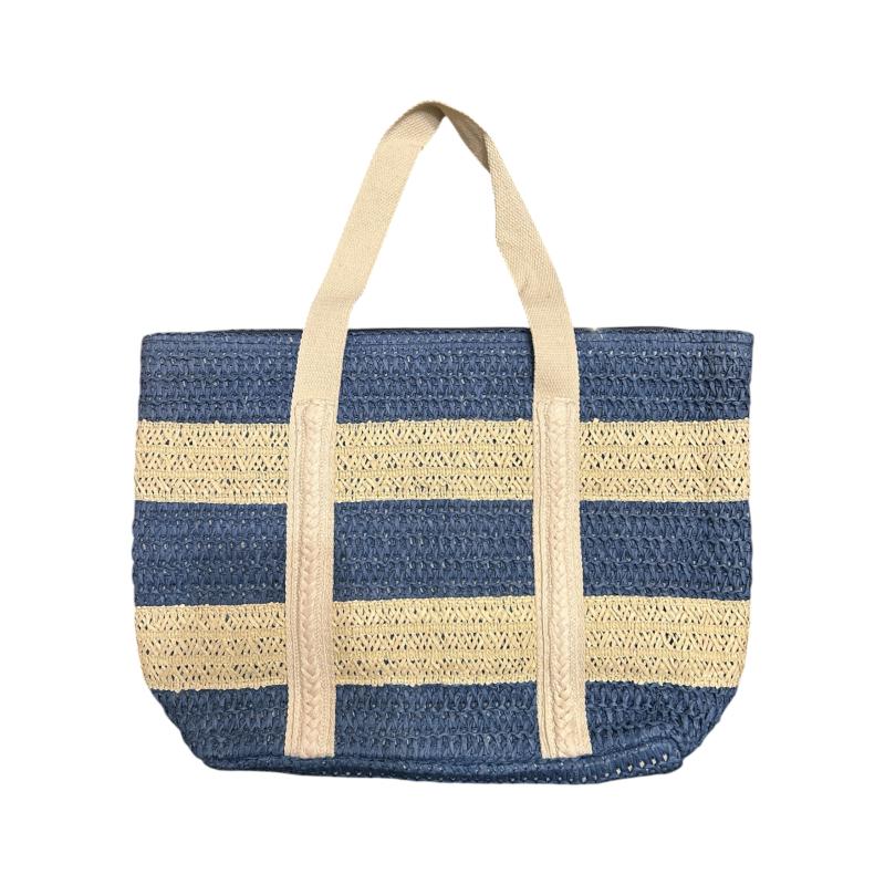 Ψάθινη τσάντα θαλάσσης με βάση απο εκρού χρώμα και χοντρή ρίγα σε διάφορες αποχρώσεις, που κλείνει με φερμουάρ. Ανακαλύψτε την κομψότητα και την προστασία του καλοκαιριού με αυτή τη μοναδική τσάντα θαλάσσης! Κατασκευασμένη από ανθεκτικό ύφασμα και σε αποχρώσεις του μπλε είναι δανική για όσους αγαπούν το στυλ με ελληνικό χαρακτήρα. Το χοντρό ανθεκτικό σχοινί ως χερούλι και η ευρύχωρη χωρητικότητα, την καθιστά ιδανική για την παραλία, την πισίνα ή ακόμα και για τις βόλτες σας.
